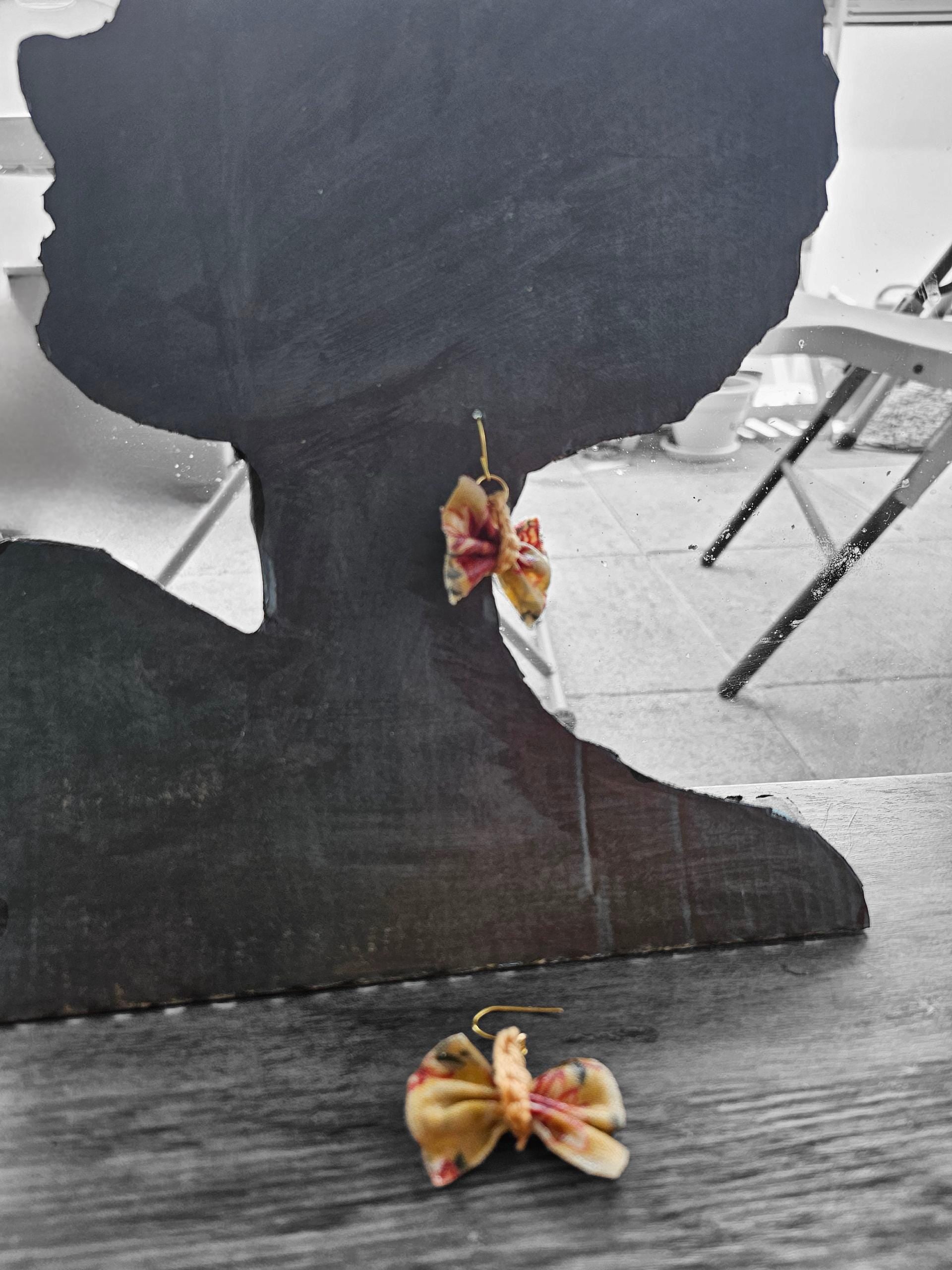 These bow tie earrings are entirely handmade and assembled in France. They add a unique touch of charm to your look. Their delicate wet-look finish and timeless design make them perfect for any occasion.