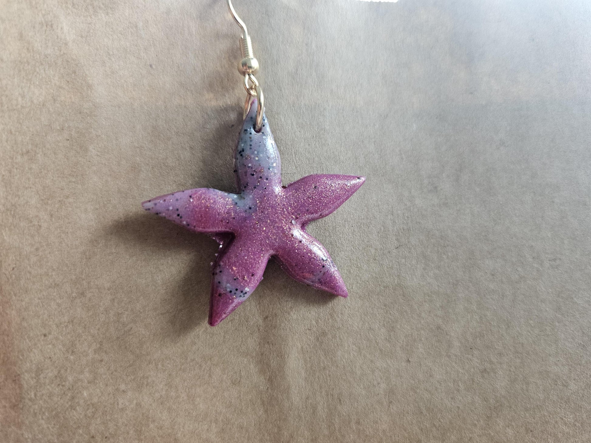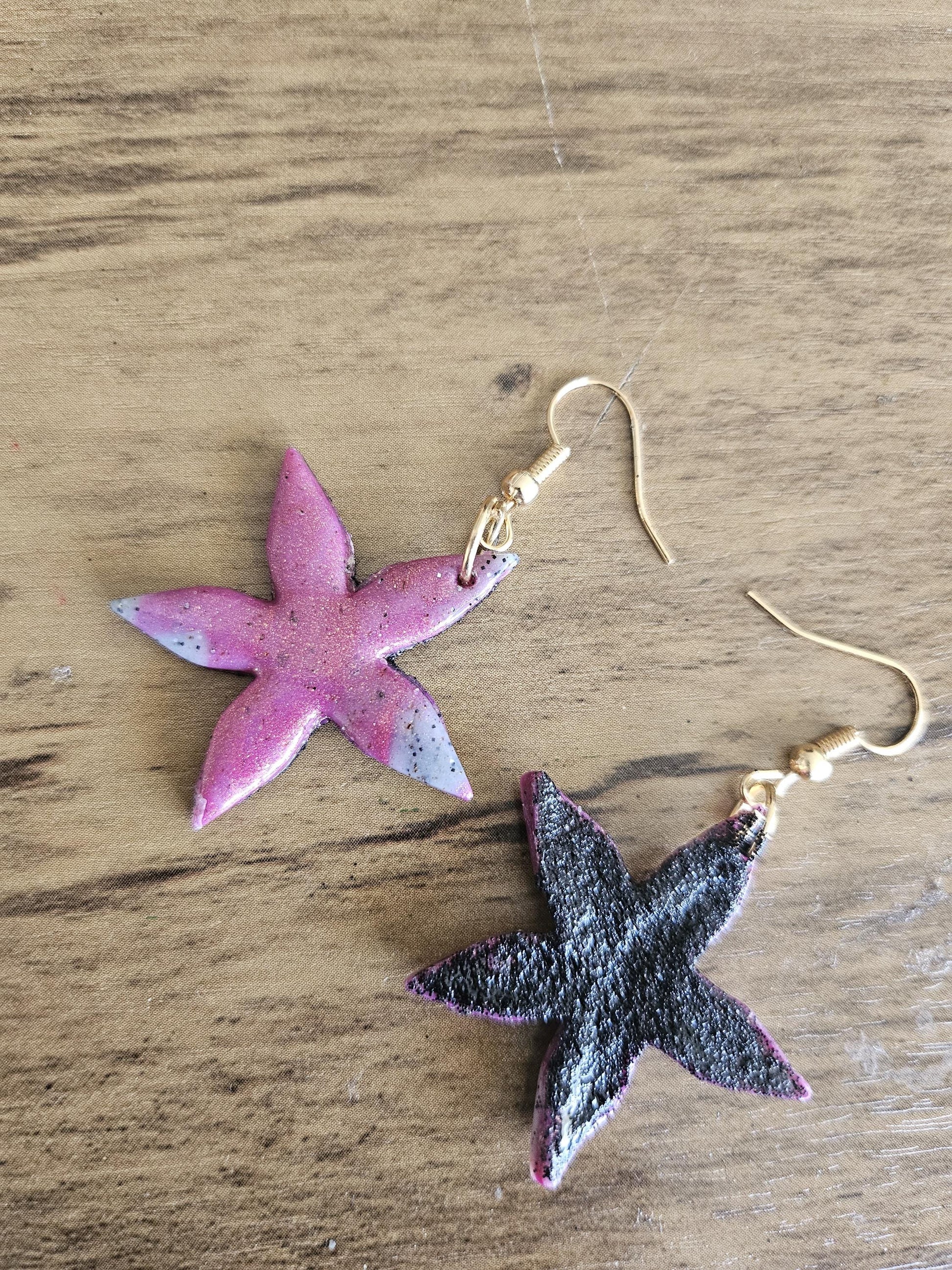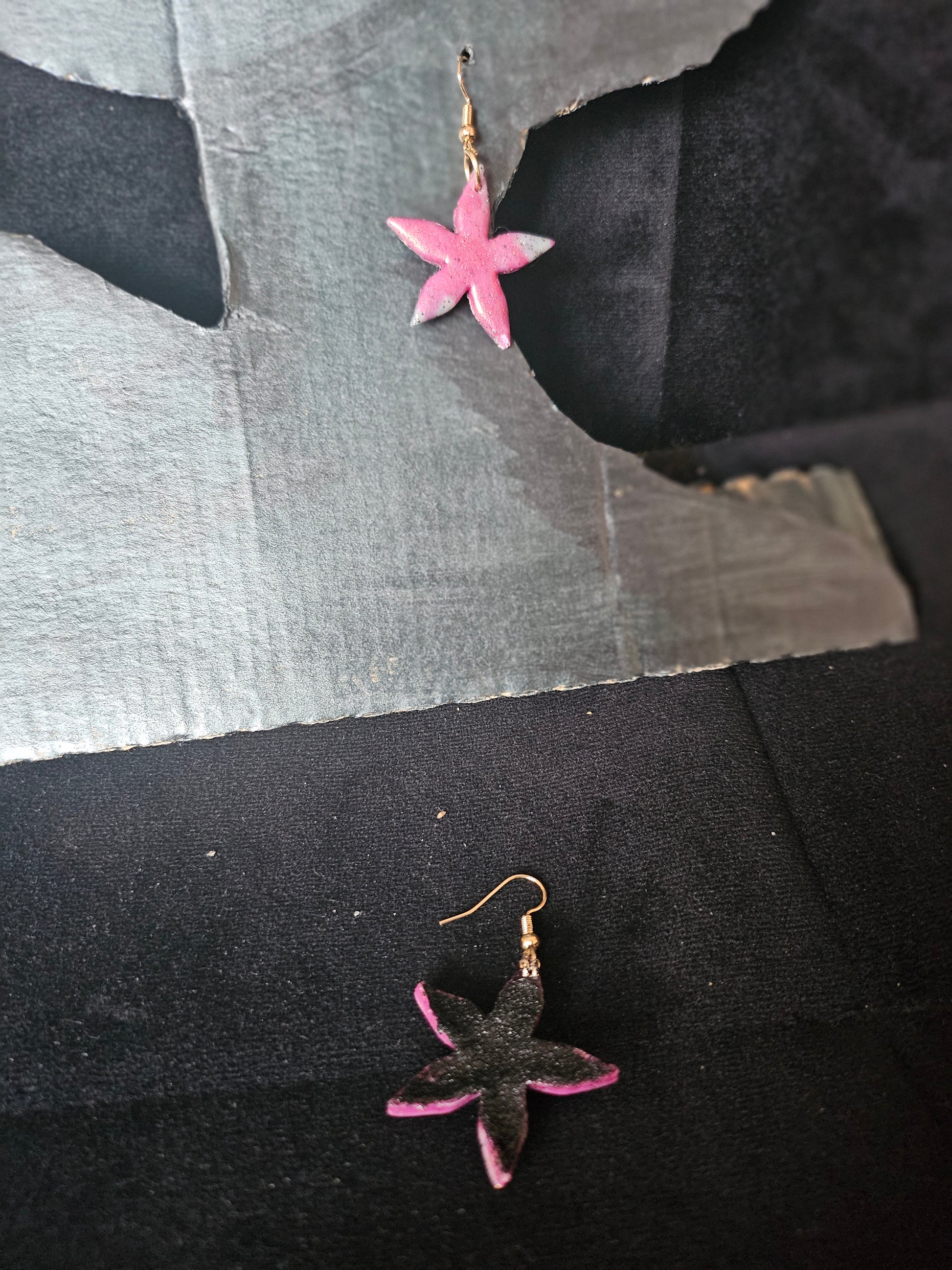 These beautiful earrings are entirely handmade and assembled in France. Each pink, white, and gray polymer clay star pendant is unique, with a black glittery backing for a touch of sparkle.