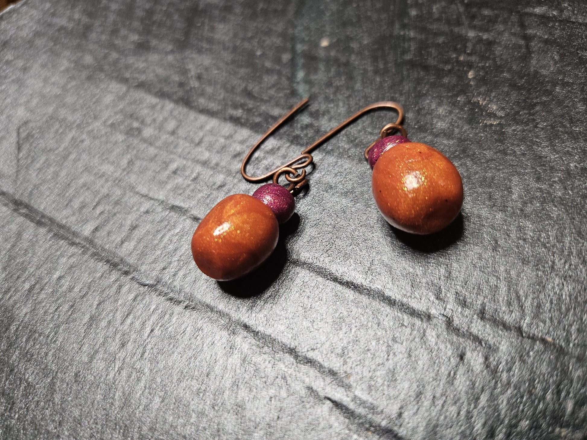 These small, round earrings are entirely handmade and assembled in France. Their vintage style in pearly copper and pink polymer clay adds an irresistible retro-chic touch to your look.