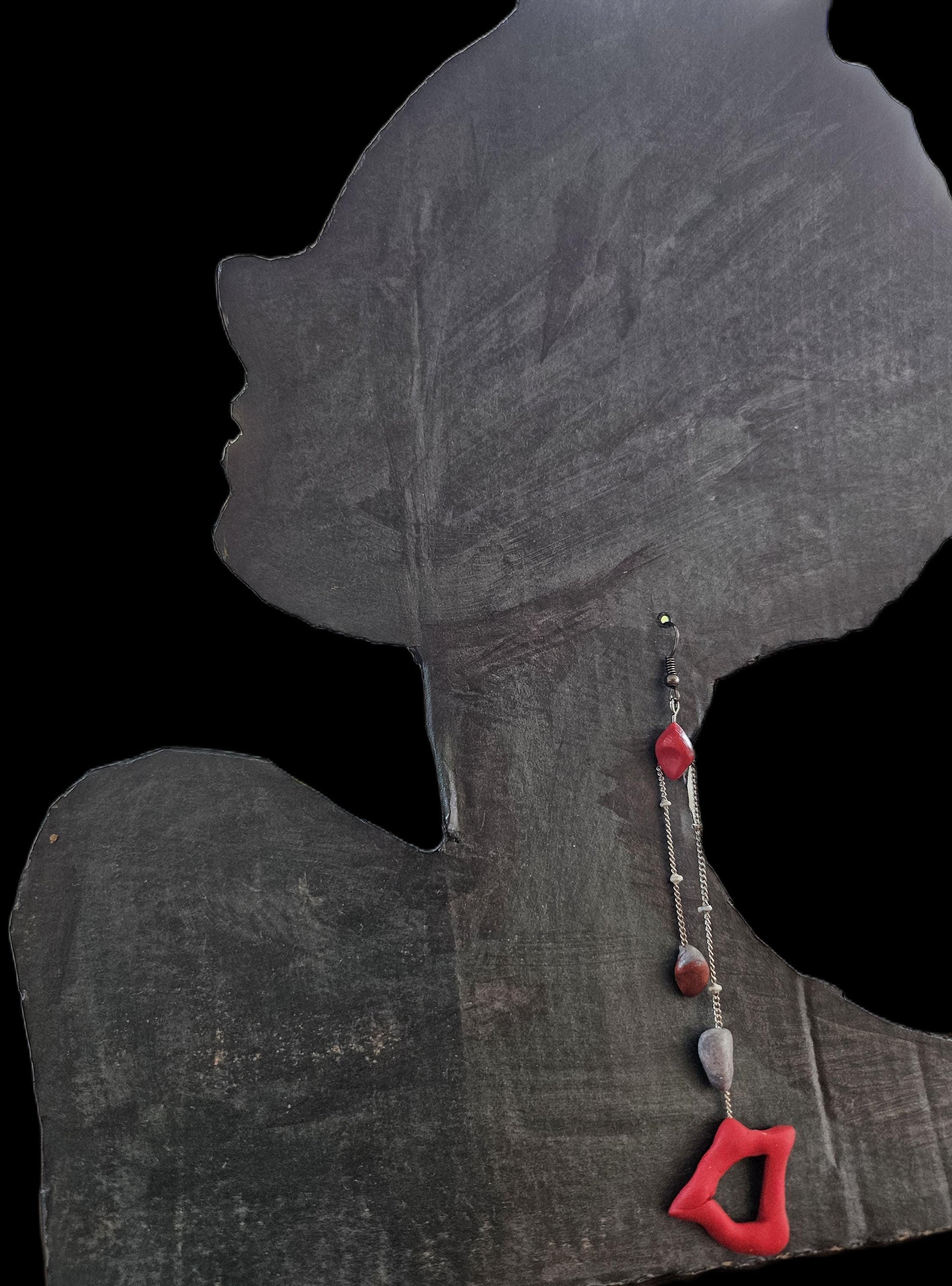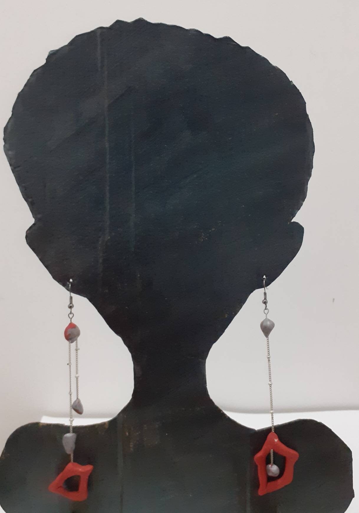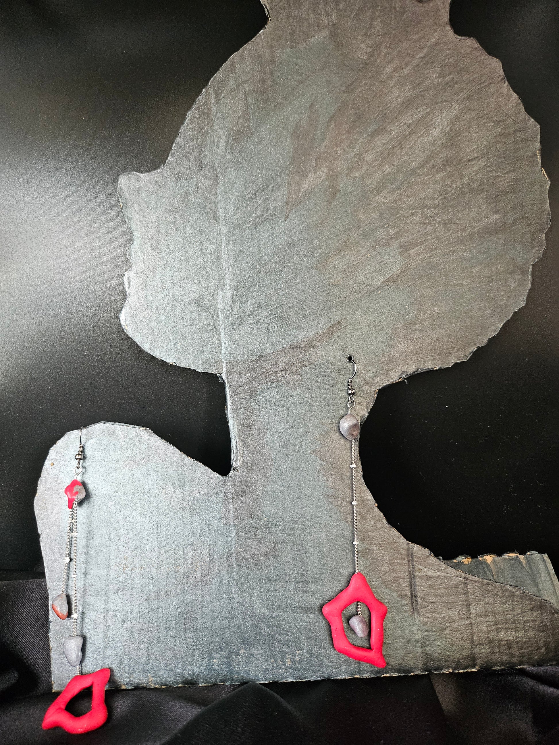 Boucles d'oreilles asymétriques rouges et grises - Bijoux artisanaux fait main